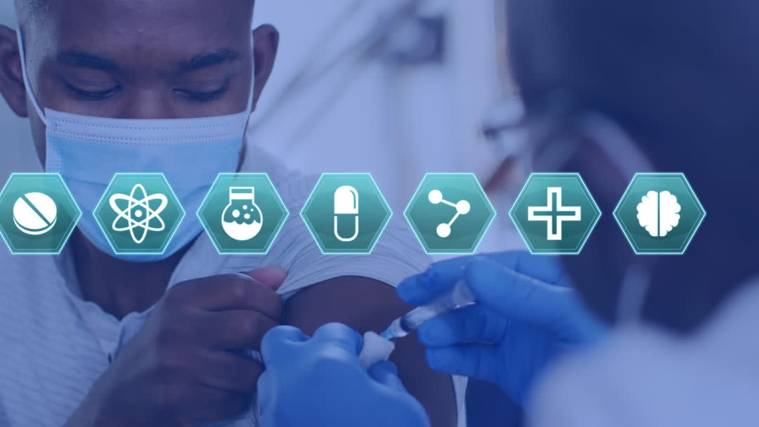 A healthcare professional administers a vaccine to a man wearing a mask. Animated medical icons, representing different aspects of healthcare and medicine, are overlayed. This can be used in contexts promoting vaccination campaigns, healthcare technology advancements, medical practice adverts, or public health awareness strategies.