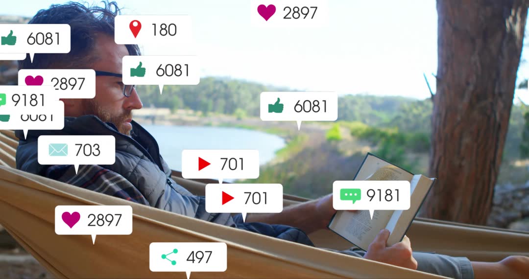 Man reclining in a hammock by a serene lake while reading a book conveys leisure and relaxation. The floating social media icons symbolize modern connectivity, merging tranquility with technology. This video is ideal for themes related to digital marketing, social media influence, lifestyle, and the balance between technology and nature.