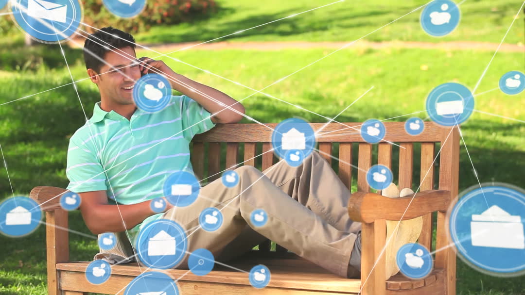 Man sitting comfortably on a park bench using his smartphone. Overlaid digital icons suggest connectivity and global networking. Suitable for illustrating concepts related to modern communication technology and global connectivity.