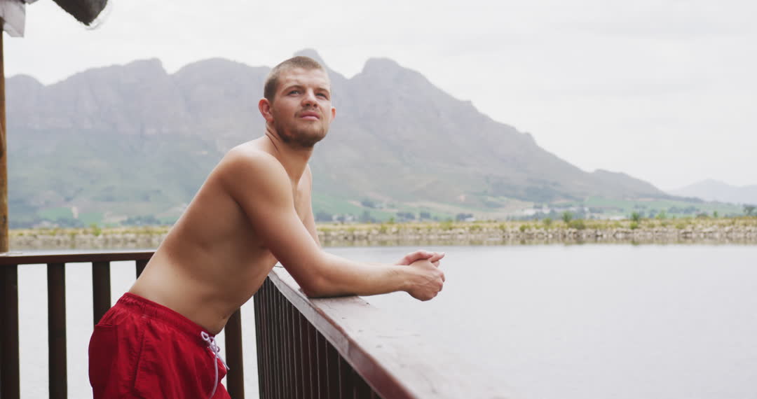 - Man Relaxing in Swim Trunks Overlooking Mountain River View