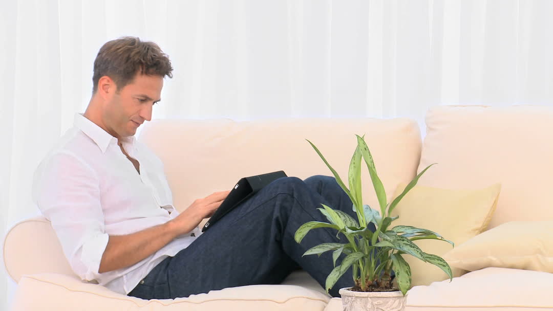 - Man Relaxing on Sofa Using Laptop for Leisure Browsing