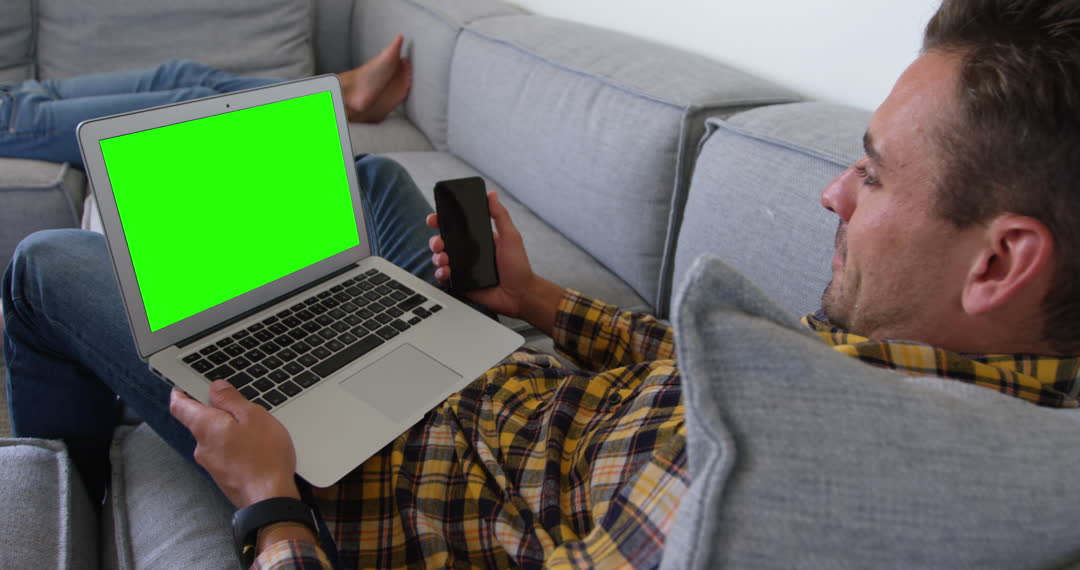 This video of a man casually relaxing on a sofa, using a laptop and phone, is perfect for illustrating home office concepts or leisure technology use. The green screen on the laptop is useful for customization. Ideal for lifestyle blogs, tech advertising, casual attire fashion sites, and articles related to comfortable living or productivity tips.