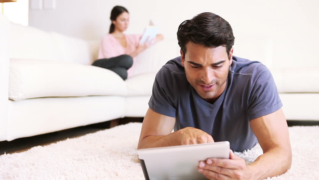 Man lying on soft carpet floor, calmly engaging with tablet in bright, modern living space. Woman in background focused on reading, creating relaxed, homely setting suitable for marketing technology, home decor, or lifestyle products. Great for illustrating family bonding or modern leisure activities.