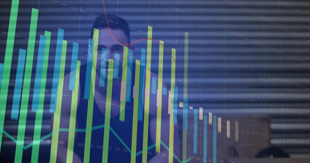 Man is leaning forward catching his breath on a gym bench, merging videory of fitness and analytical progress. Transparent chart overlays show growing achievements ideal for visualizing the connection between effort and results. Captures essence of motivation in fitness. Suitable for fitness apps, gyms focused on progress tracking, or motivational exercise campaigns.