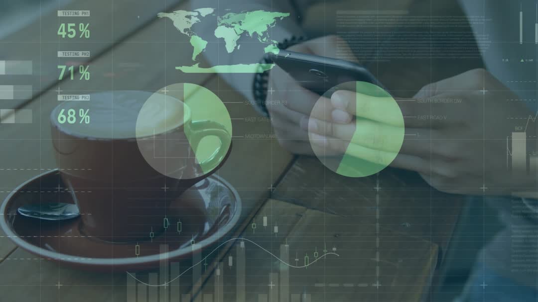 Video showing close-up of male hands scrolling smartphone beside coffee cup on wooden table while semi-transparent finance graphics are overlaying frame. Green pie charts, percentage metrics and candlestick lines are floating across screen with world map highlight, creating impression of real-time market monitoring and data review. Clip is working well for fintech tutorials, trading app demos, business presentations, social media ads and corporate explainer videos. Serving as modern background for landing pages, investor reports, online courses and news segments about markets and digital finance. Visual tone is warm, casual and professional with natural cafe lighting and tight composition focusing on hands and device.