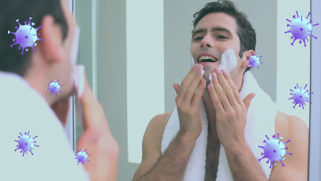 A man is shaving in front of a mirror with animated virus cells superimposed on the video. This depicts health hygiene and COVID-19 awareness. Useful for campaigns on hygiene, public health education, or illustrating the importance of personal care during pandemics.