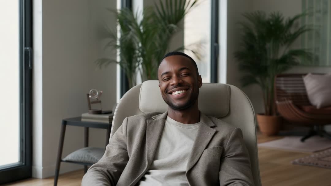 - Man Smiling and Relaxing in Modern Lounge with Armchair