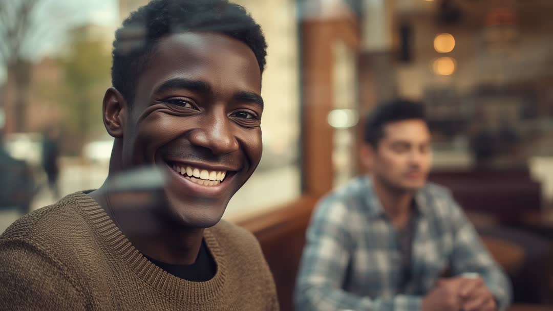 - Man Smiling Warmly Through Window in Cozy Cafe Setting