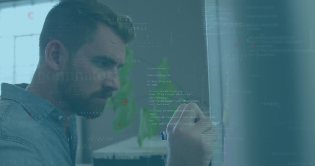 Caucasian man writing strategic notes on a transparent office window, suggesting an environment ripe with innovative planning and problem solving. The overlay of data processing adds a technology and future-forward dimension, perfect for illustrating concepts around business strategies, tech startups, and collaborative workspaces.