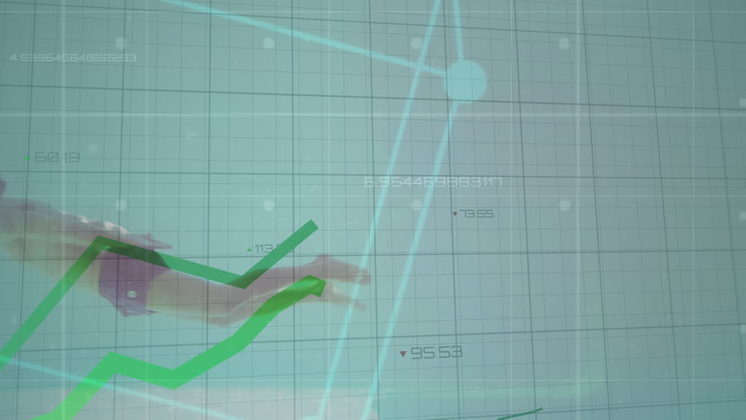 Image depicts a man swimming underwater in a pool with a digital overlay of financial graphs and statistics. Ideal for concepts combining physical fitness and business trends, merging sports and finance, or emphasizing dynamic and active lifestyles. Suitable for use in business presentations, health and sport publications, or financial analytics media.