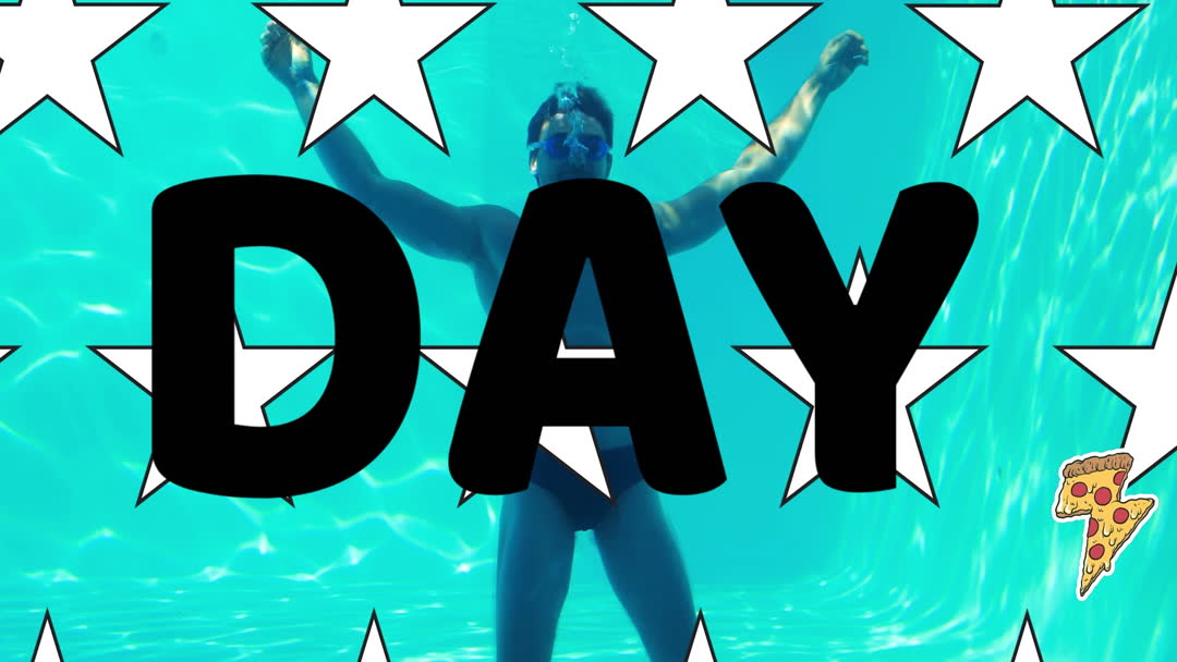 Young man enjoying swimming underwater in a pool, surrounded by overlay elements such as stars and bold typography. Fun and vibrant illustration style perfect for promoting summer activities, swimwear brands, or leisure events needing dynamic visual engagement.