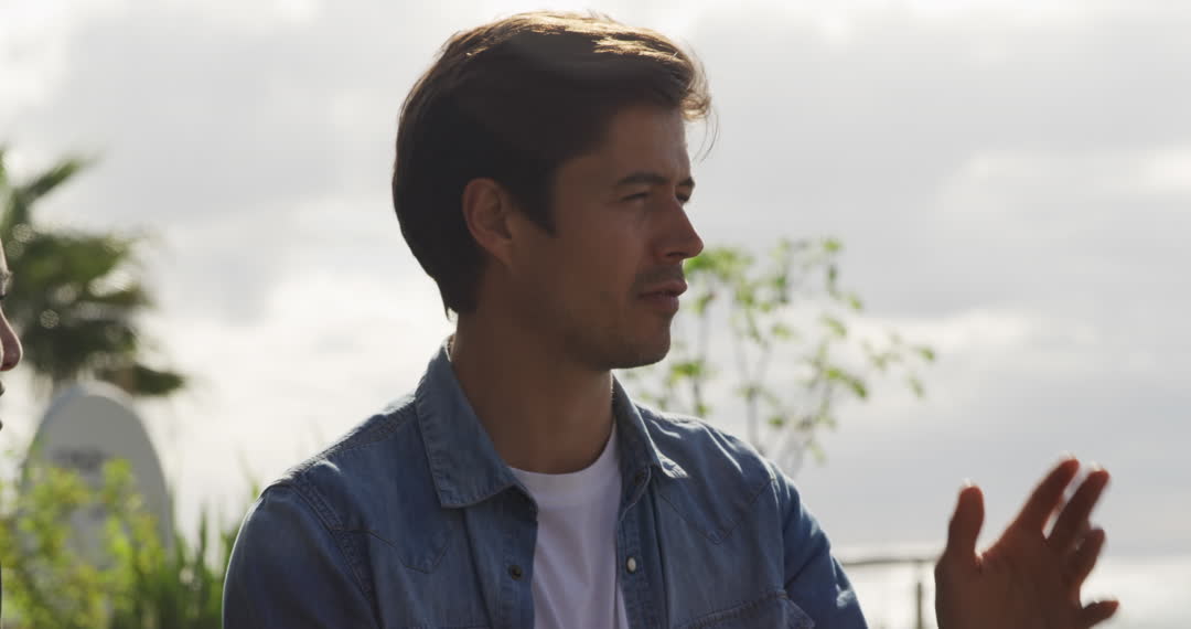 A man is engaging in a conversation on a rooftop terrace during a cloudy day, appearing relaxed and sociable. He is dressed casually, suggesting he is at ease and enjoying leisure time. This can be used in contexts related to socializing, outdoor gatherings, or lifestyle blogs that discuss casual fashion and relaxed living.