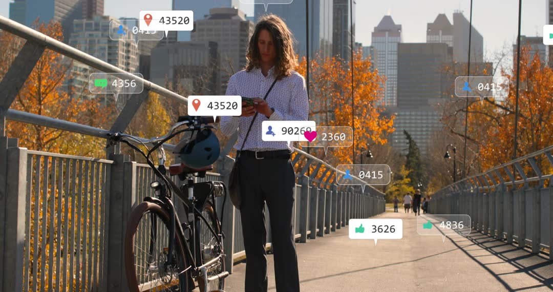 - Man tapping phone on urban bridge while social media notifications popping around bicycle and people
