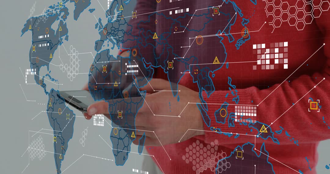 Video showing midshot of man tapping smartphone while animated world map and data overlays expanding across frame. Overlays featuring hexagonal grids, nodes, warning icons and connecting lines in blue and orange tones. Composition focusing on hands and device with red sweater adding color contrast. Clip working well for technology marketing, app demo, cybersecurity presentation, corporate explainer, news opener, startup pitch and social media ad. Use as background plate for lower third, overlay for UI walkthrough, transition for product launch or loop for trade show display. Editing suggestions: pair with voiceover about global connectivity, add motion graphics to emphasize data flow, trim to 5-10 seconds for social use. Footage compatible with 16:9 timeline and multi-platform campaigns.