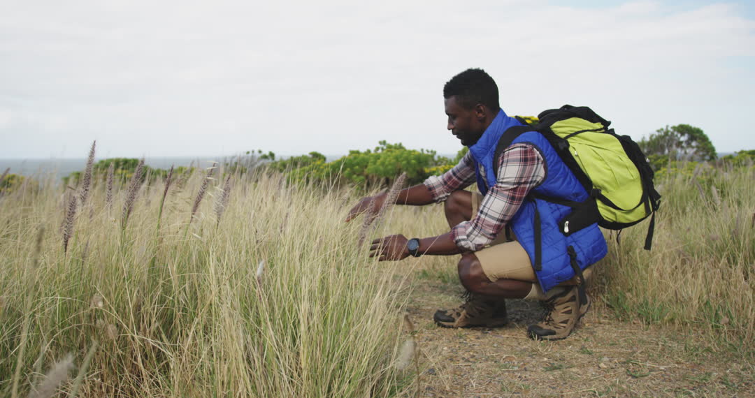An African American man crouches in a picturesque rural setting, closely observing and touching wheat grass while wearing a large camping backpack and outdoor gear. This video captures a sense of adventure, exploration, and an appreciation for nature and peacefulness. Perfect for use in promoting outdoor activities, wellness blogs, camping and adventure brands, as well as educational materials centered on plant life and nature experience.