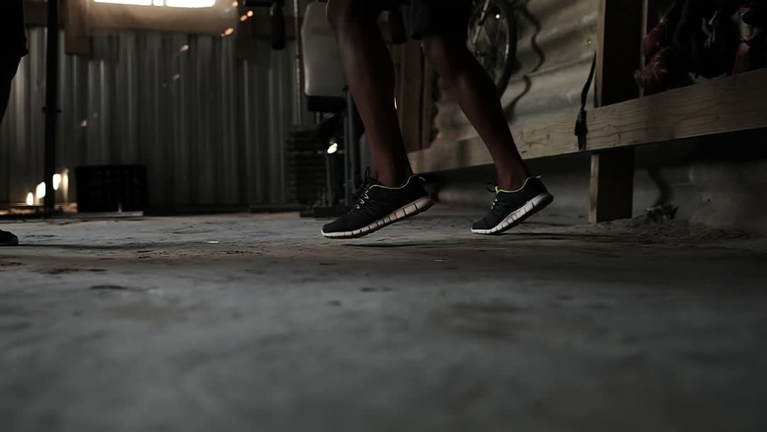 Low angle view of a man in sports attire training with his coach, emphasizing his footwork. This setting creates a motivational clip related to athleticism and dedication, perfect for fitness promotions, training montages, and sports brand advertisements.