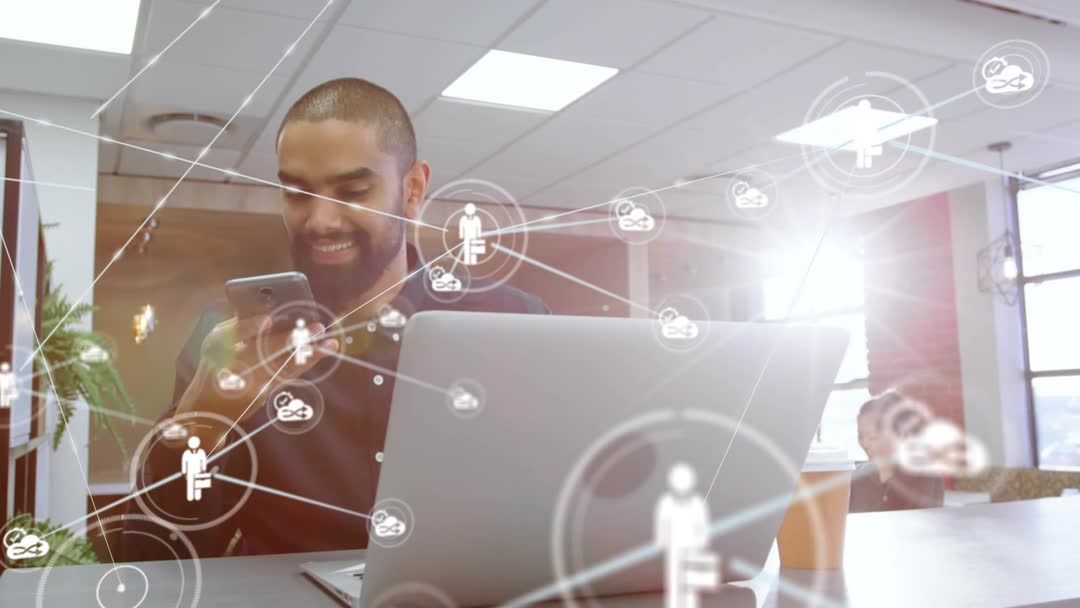 - Man using smartphone while animated network nodes connect remote team in coworking office