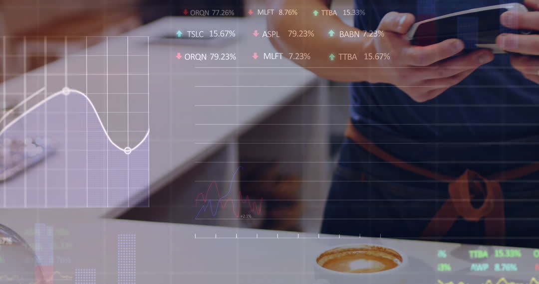 A man utilizes a smartwatch to make a contactless transaction at a cafe, with a latte on the counter. Transparent overlays of stock graphs illustrate the concept of digital transactions in the modern age, tying themes of technology and finance with everyday activities. Ideal for content on innovations in financial technology, digital banking solutions, or market analysis.
