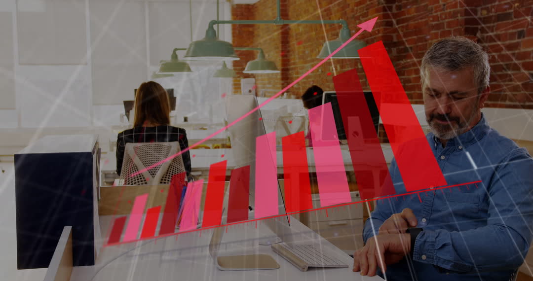 Man is sitting at an office desk checking his smartwatch while a virtual graph of increasing data appears. Represents productivity, technology integration in business, and data-driven success. Useful for articles on business growth, technology in the workplace, or productivity strategies.