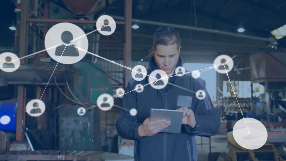 - Man Using Tablet in Industrial Environment with Networking Graphics