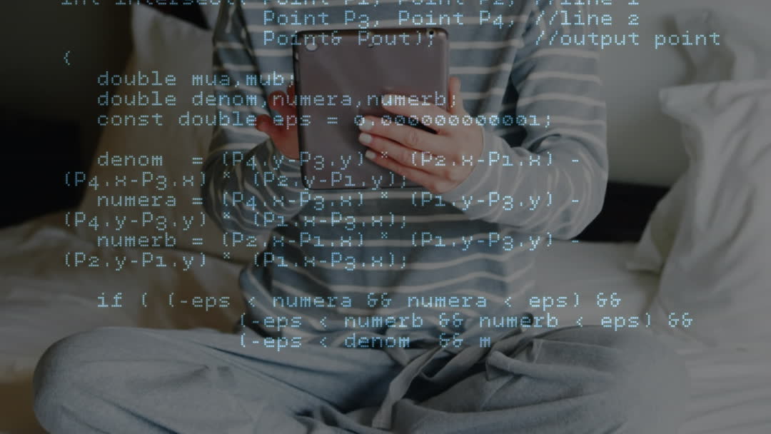 Man sits on bed using a tablet with projected code script overlay, capturing concept of remote work, programming, and digital data trends. Useful for illustrating topics in tech innovations, big data analysis, and software development environments.