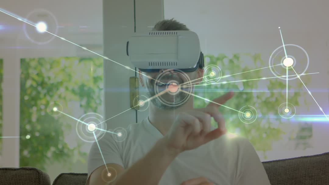 Depicts a man engaged in using a VR headset with superimposed digital data connections. This video is useful for illustrating modern virtual reality applications, tech innovation, or connected experiences and is suitable for tech blogs, innovation presentations, and digital product demo purposes.