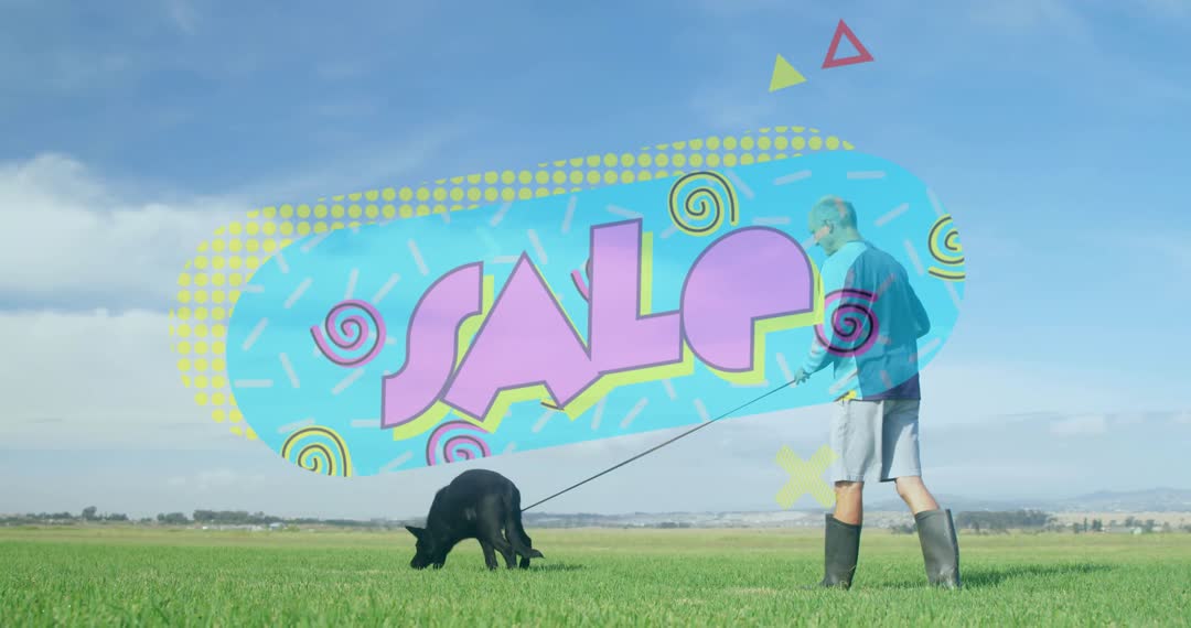A man is seen walking his dog in a vast, green field under a clear blue sky. Overlaying this serene video is a vibrant and colorful 'SALE' animation, featuring bold designs and eye-catching colors, capturing themes of discount and promotion. This visual can be used for marketing campaigns for outdoor gear, pet products, or seasonal sales events, adding an engaging and lively touch to the viewer's experience.