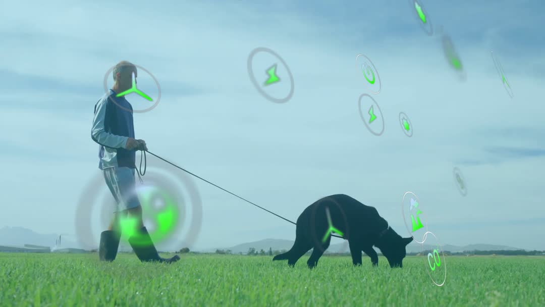 Man Walking Dog with Environmental Technology Icons in Green Field Video