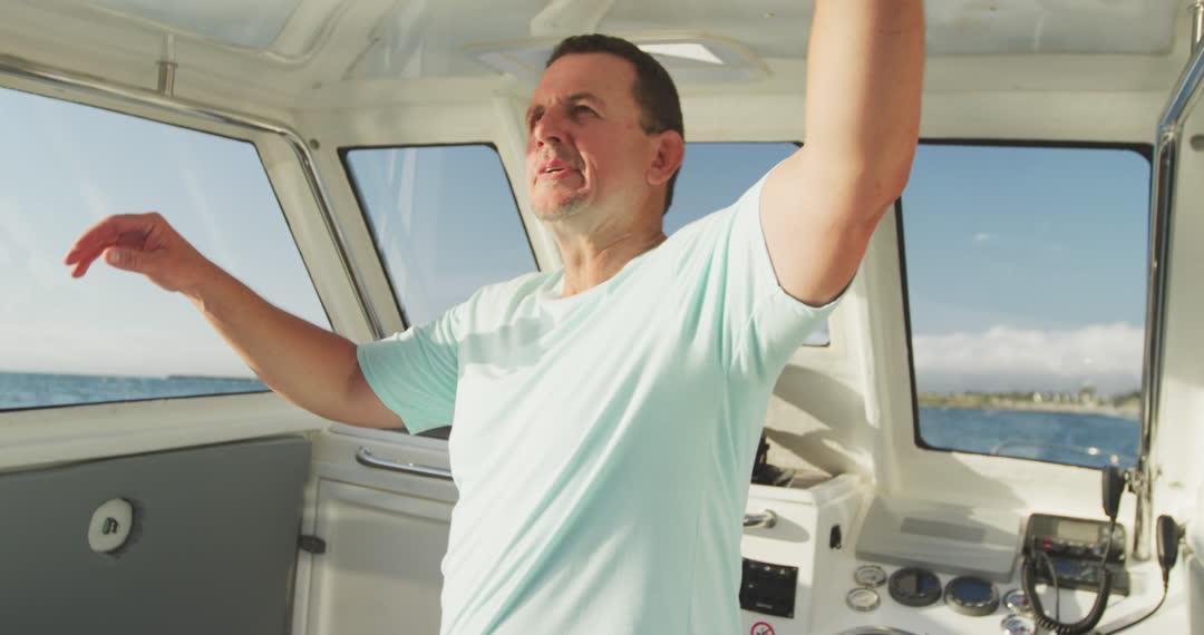Man enjoying a leisurely walk in the steering room of a boat on a sunny day, creating a relaxed and adventurous atmosphere. This visual is perfect for promoting travel, boating activities, maritime lifestyle, and captivating videory related to ocean exploration. It is suitable for ads or articles focusing on recreational boating or outdoor adventures at sea.