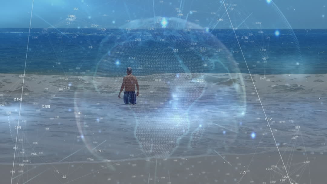 Man Walking into Ocean with Digital Globe Overlay Concept Video