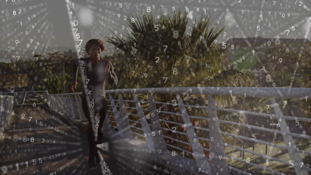 Visual captures a man crossing a bridge with an overlay of floating numerals and symbols. Scene suggests technology's role in lifestyle, communication, and data interaction, highlighting themes of innovation and connectivity. Useful for concepts of urban life, tech integration, or outdoor routines in a modern context.