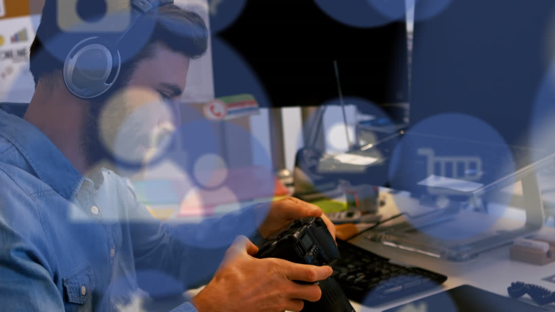Man Wearing Headphones with Technology Icon Overlay Video