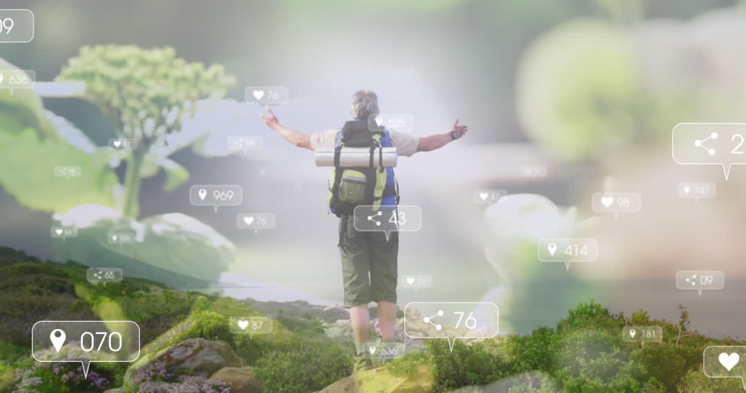 A man in outdoor hiking gear stands with arms raised amidst a lush natural landscape. Superimposed digital icons and numbers suggest connectivity and social engagement themes, blending technology with the beauty of nature. This imaginative concept can be used to depict the intersection of modern technology with outdoor adventures, ideal for travel articles, technological innovation ads, and social media impact studies.