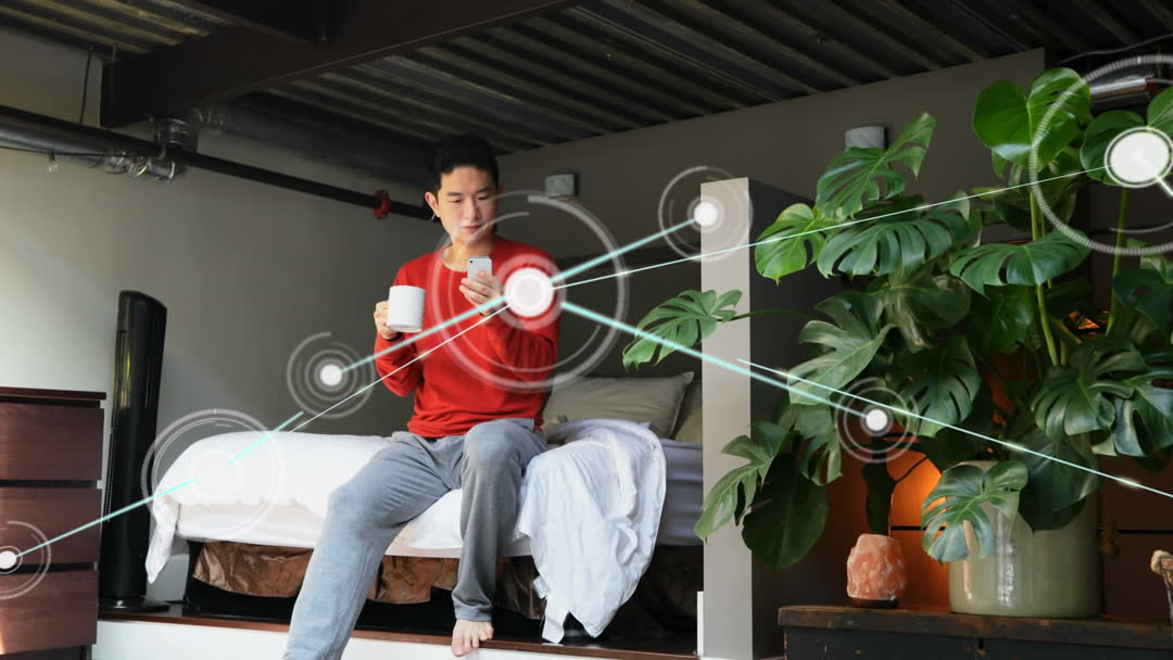 A man relaxes in a modern loft while holding a cup and viewing digital network connections. This visual is ideal for concepts related to connectivity, modern living, smart technology, and daily life interaction with digital interfaces. Perfect for lifestyle blogs, tech-related advertisements, or presentations on the integration of technology into home environments.