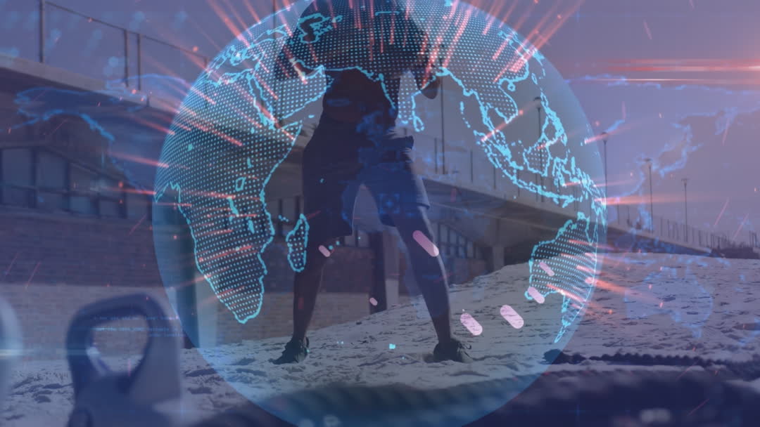 A man working out on a beach is layered with a spinning digital globe, symbolizing the integration of sports and technology. The scene captures a modern fusion of physical and digital worlds, implying innovation in fitness tracking and global connectivity. Suitable for materials on futuristic fitness concepts or global health trends.