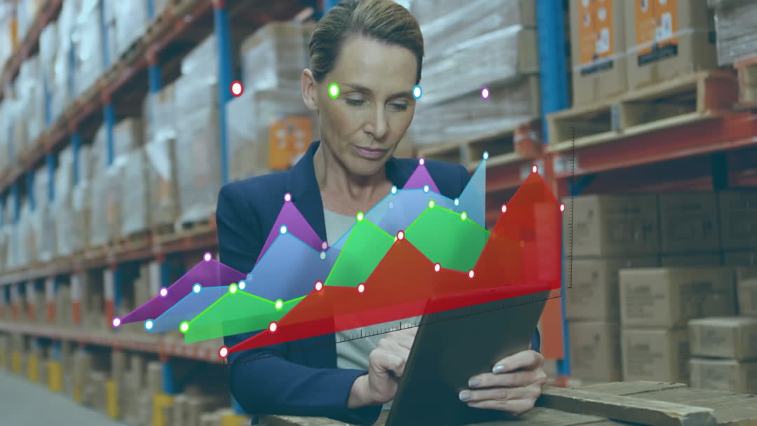 Business setting showing a female manager using a digital tablet in a warehouse with a colorful data graph overlay. This video is perfect for illustrating concepts of inventory management, logistics, or data analysis in marketing materials, presentations, or websites focusing on modern business solutions and technology.