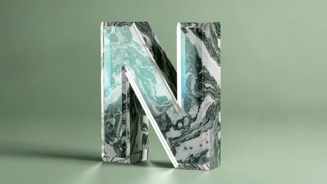 AI Generated Image. Video showcases a stylized 3D letter N, reminiscent of marble, rotating slowly to reveal intricate blue veins. Set against a calm green backdrop, it offers a display that highlights contemporary design and abstract art principles. Suitable for use in design portfolios, home décor concepts, or as a digital art piece in virtual environments, demonstrating both creativity and sophistication.