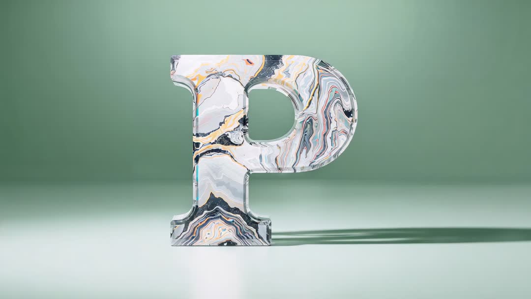 AI Generated Image. Unique visual features marble-patterned letter P standing on glossy green surface, interplay of light and shadow adding depth. Useful for typography design, art installations or creative presentation projects showcasing elegance and modern minimalism.
