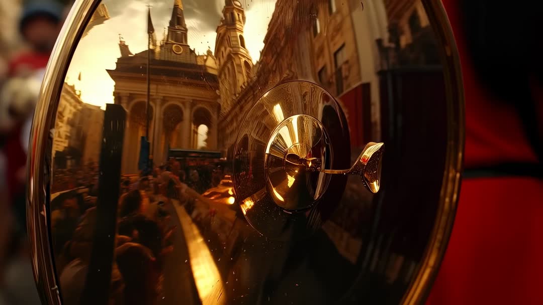 AI Generated Image. Close-up shot showing polished brass bell reflecting cathedral facade, marching crowd, and red-coated musician during street parade. Warm golden light bathing scene, creating cinematic reflections and deep contrast while movement of procession adding dynamic energy. Video working well as B-roll for travel and culture documentaries, parade coverage, music film openers, event promos, historical reenactment trailers, broadcast segments, and social media reels. Clip offering tight focus on instrument with shallow depth of field and moving urban background, allowing editors to cut for transitions, slow-motion sequences, and title overlays. Suggested uses: tourism website hero, festival marketing, cultural celebration storytelling, educational program about traditions, and commercial campaign needing regal, ceremonial atmosphere.