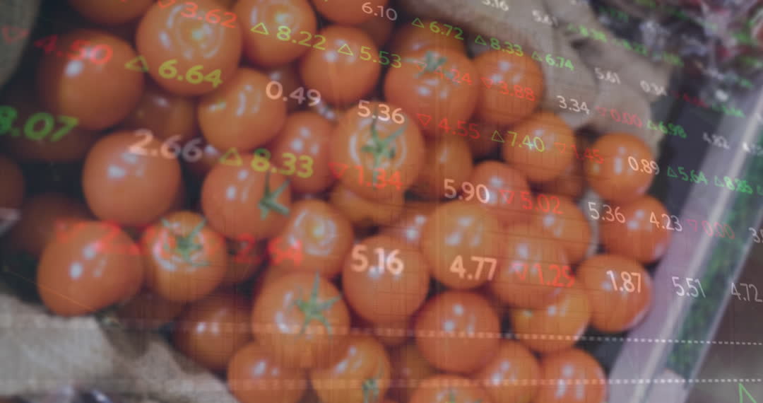 Fresh tomatoes on display in a supermarket with overlaid digital numbers symbolize dynamic market conditions and sales trends. Utilized for topics on agriculture, grocery pricing, market fluctuations, economic effects on food industry, or visual commentary on consumer goods.