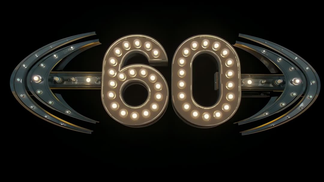 AI Generated Image. Video frame showing large illuminated 60 formed from circular warm bulbs sitting on metal backplate with curved metallic arcs flanking each side, bulbs pulsing and reflections shifting against deep black background, creating dramatic contrast and cinematic mood. Composition favoring symmetry and negative space, allowing easy text overlay and cropping. Using for event promotion, 60th anniversary and birthday milestone visuals, theater or cinema branding, stage show intros, countdown sequences, social media shorts, website hero banners, print posters, invitations, digital signage. Offering loop-friendly motion for ambient background, scalable for high-resolution print, color-grading friendly for warm vintage look, adaptable for multiple aspect ratios and easy integration into branded motion graphics.