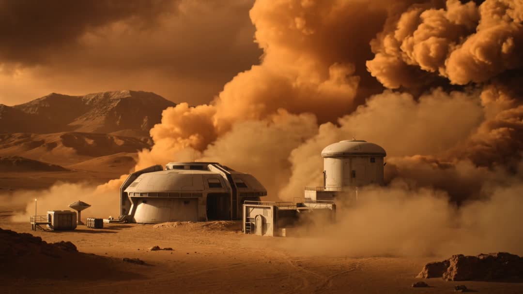 - Mars Outpost Battling Massive Orange Sandstorm While Dust Clouds Engulf Habitat Modules