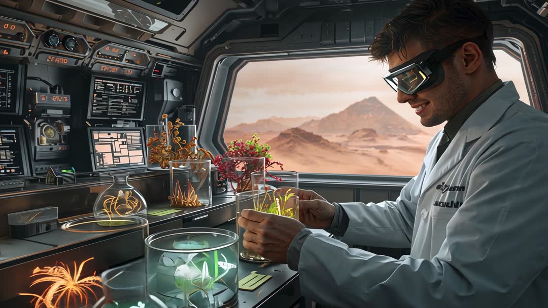 - Mars rover scientist examining bioluminescent plants inside lab cabin overlooking desert
