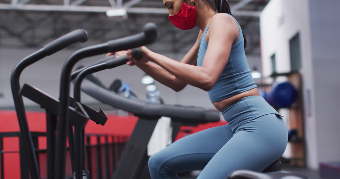 A fit woman is actively exercising on a cross trainer, wearing a mask in a gym setting. She is in shape and dressed in blue athletic wear. This visual captures persistence in maintaining fitness routines even during challenging times like a pandemic. Ideal for articles related to fitness, health tips during COVID-19, or promoting gym safety protocols.