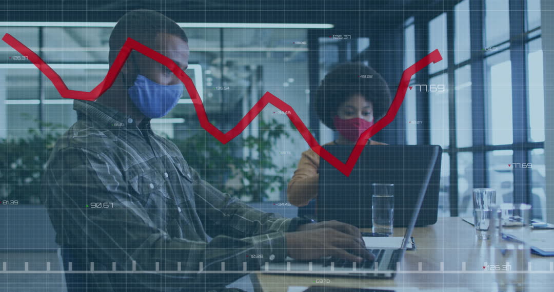 Two colleagues seated at a modern workspace are seen attentively analyzing financial data. A dynamic graph overlays the scene, indicating stock or market trends, reflecting an air of professionalism and focus. Both individuals are wearing protective masks, symbolizing continuity in business during a pandemic. This video is perfect for illustrating themes of financial analysis, corporate adjustments during global health challenges, or the fusion of technology and business strategy in modern workplaces.