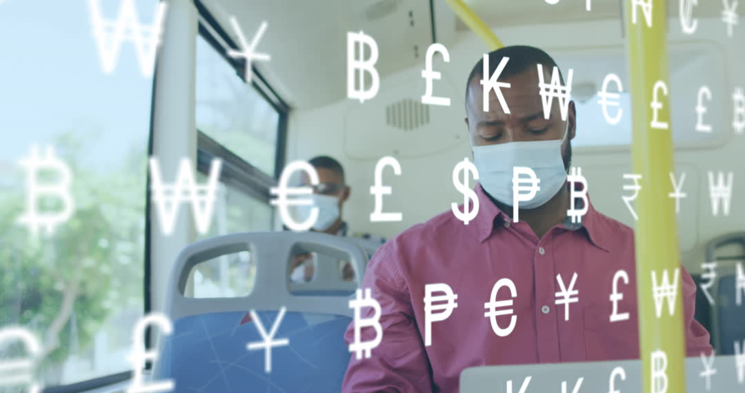 This video depicts a man wearing a mask using a laptop on a public bus, with various international currency symbols overlayed. It suggests digital financial themes and international connections. Ideal for content relating to blockchain, finance, technology advancements, remote work, commuting during health crises, and global economic systems.