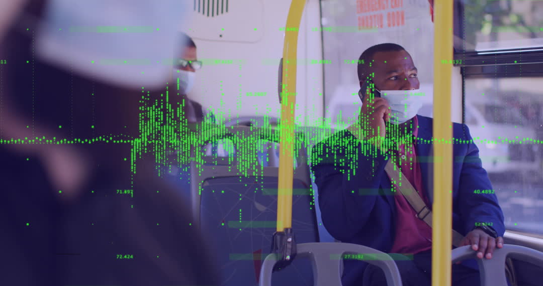 An video capturing people wearing protective face masks on a bus with an animated overlay of financial data processing. This combines themes of health safety during the Covid-19 pandemic and the world of finance and technology. Useful for content related to pandemic impacts on public transportation, financial analysis, healthcare, and digital technology advancements.