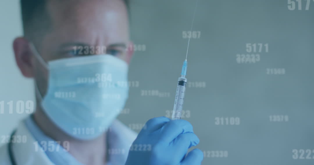 A healthcare professional wearing a face mask is preparing a syringe, shown in conjunction with animated financial data numbers. This combines themes of healthcare and financial analytics, illustrating the intersection of health sectors with finance and data science. Useful for presentations on medical costs, healthcare budgeting, impact of medicine on markets, or COVID-19 related economic studies.