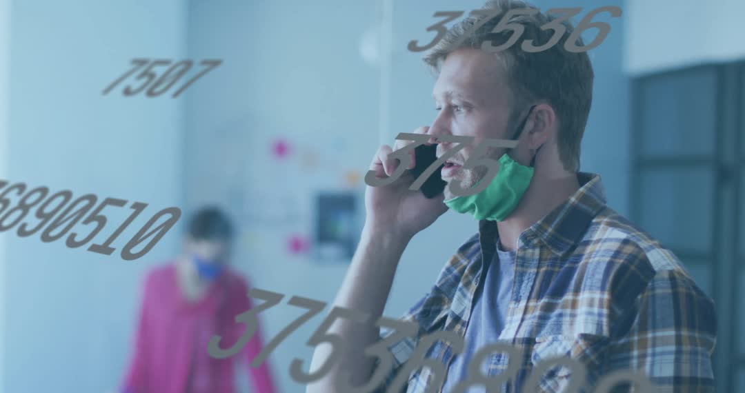 A man wearing a mask is using his smartphone in a modern office setting with overlaid numeric data. Behind him, a coworker, also masked, sorts through papers. This video conveys concepts of workplace safety, technological communication, and collaboration in a professional environment. It can be used in contexts discussing remote communication, COVID-19 safety workplace measures, data analysis and digital interfaces.
