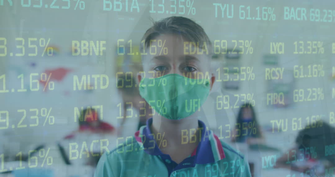 A young schoolboy in a face mask stands amidst floating data visuals displaying complex financial figures and percentages. This visual represents the intersection of education, technology, and pandemic safety measures in a modern learning environment. It is suitable for illustrating articles about technology's role in education, the impact of COVID-19 on schools, or innovations in teaching using data.